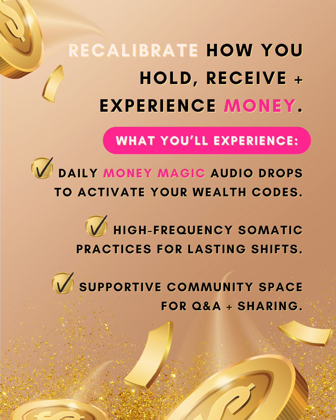 Sounds Like Money Magic is a 10-day immersive space to recalibrate your relationship with money at the level where it actually lives. In your nervous system, your body and your energetic field.